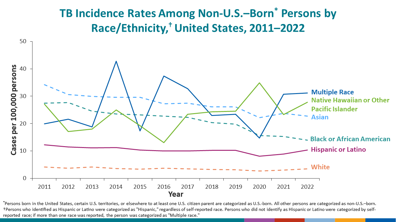 Table 4. Tuberculosis Cases, Percentages, and Incidence Rates per 100,000 Population Among Non-U.S.–Born Persons1 by Hispanic Ethnicity and Non-Hispanic Race:2 United States, 1993–2022