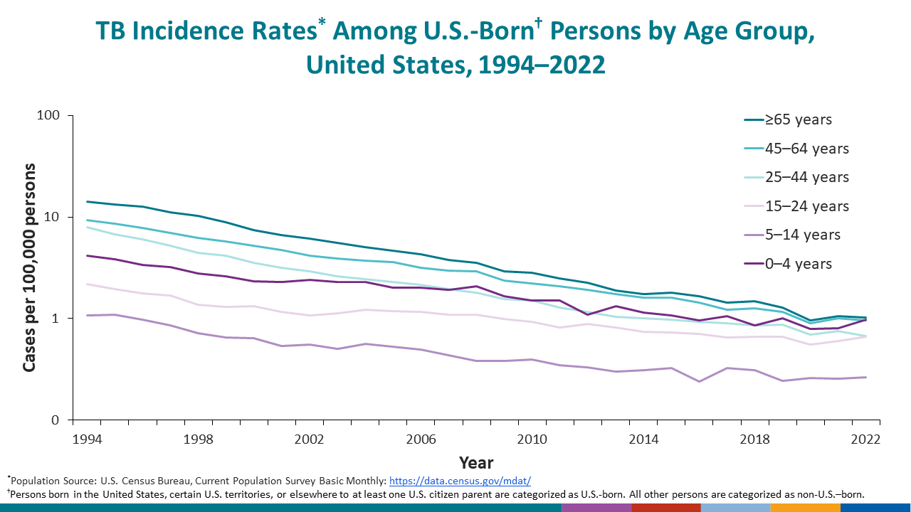 Table 6. Tuberculosis Cases, Percentages, and Incidence Rates per 100,000 Population Among U.S.-Born Persons1 by Age Group: United States, 1993–2022