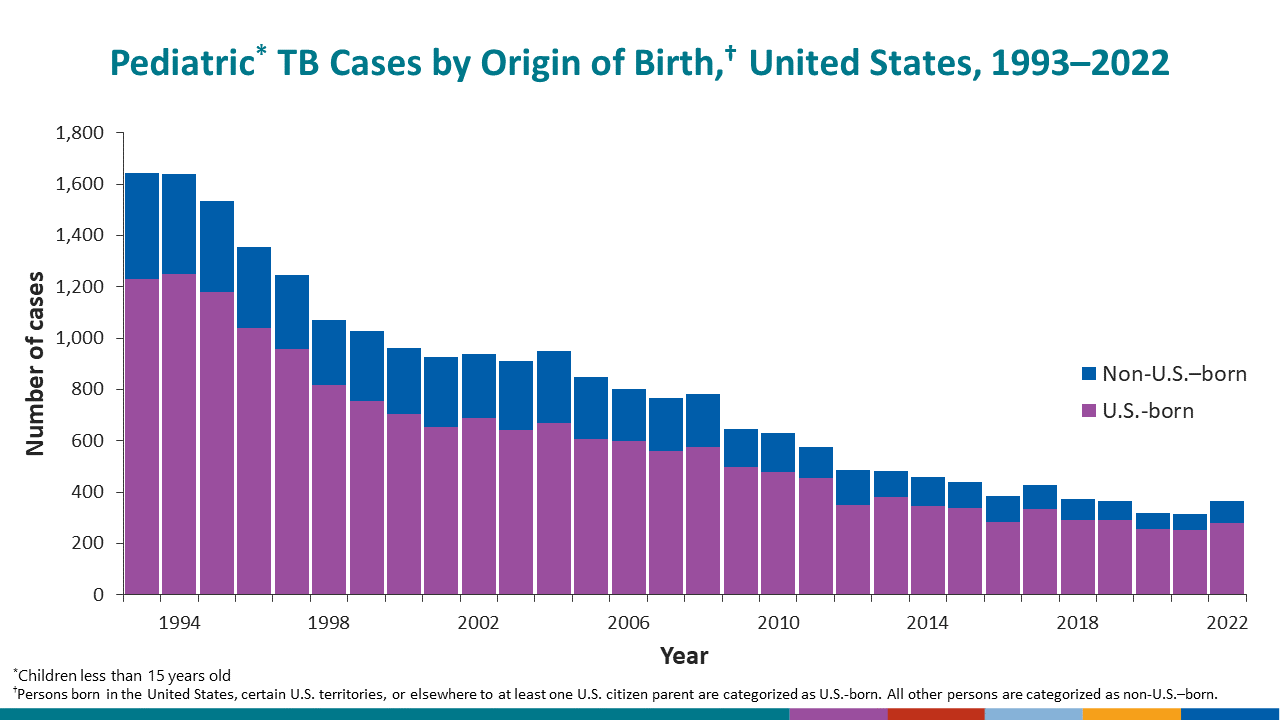 Table 7. Tuberculosis Cases, Percentages, and Incidence Rates per 100,000 Population Among Non-U.S.–Born Persons1 by Age Group: United States, 1993–2022