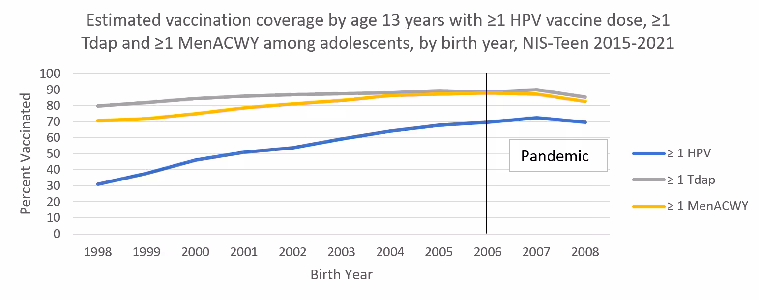 Abbreviations: HPV = human papillomavirus; Tdap = tetanus, diphtheria, and acellular pertussis vaccine; MenACWY = quadrivalent meningococcal conjugate vaccine; NIS= National Immunization Survey.