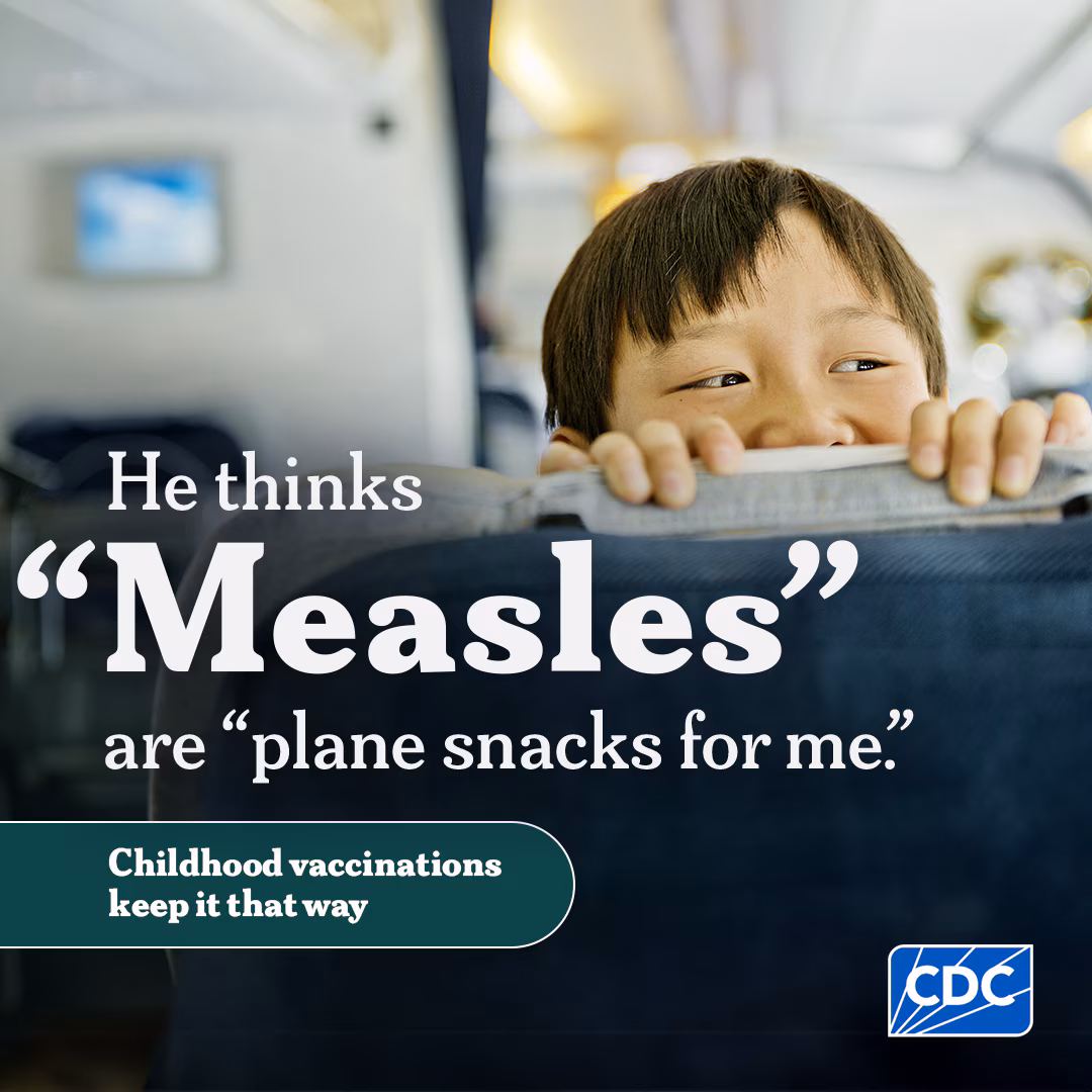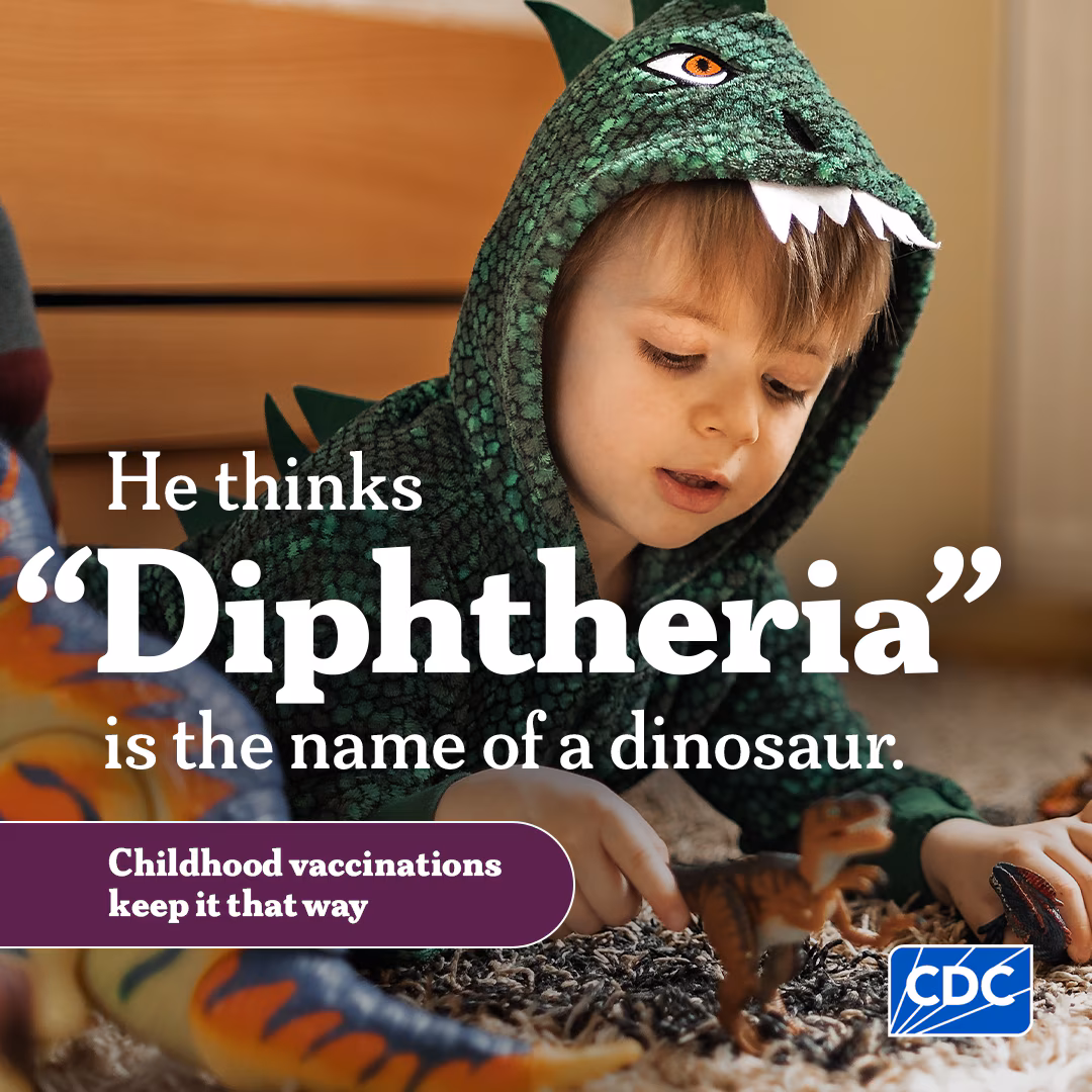 He thinks "Diphtheria" is the name of a dinosaur. She thinks "Pertussis" is something you play in music class. He thinks "Measles" are "plane snacks for me." Childhood vaccinations keep it that way.