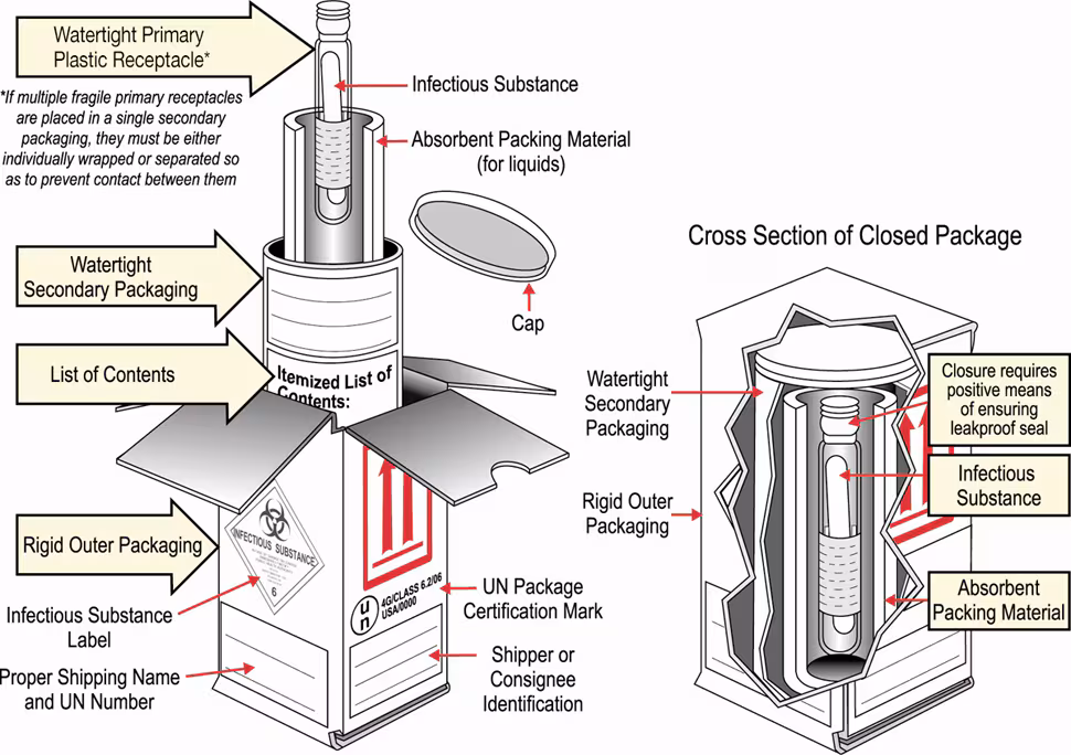 - Package specimens following the triple packaging system as shown in the diagram below, which consists of (1) a primary container (a sealable specimen container) wrapped with absorbent material, (2) a secondary container (watertight, leak-proof), and (3) an outer shipping package that meet Category A shipping requirements.