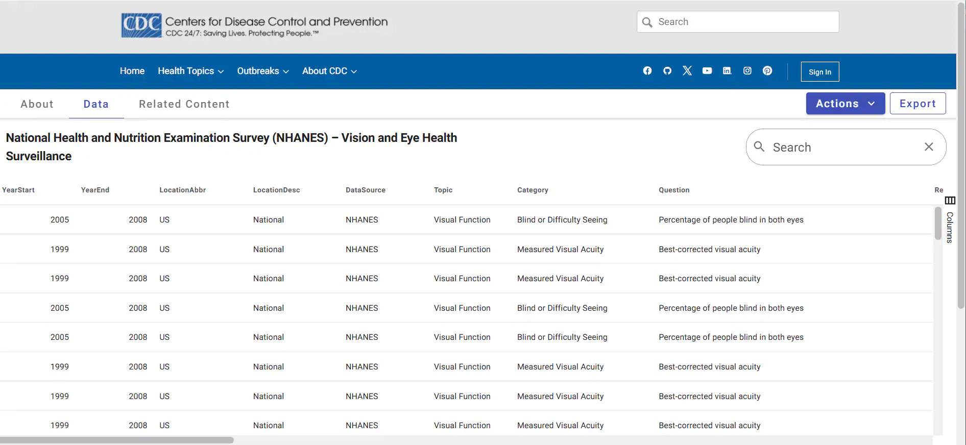 Original site: www.cdc.gov/vision-health-data/ | RestoredCDC.org is an independent project, not affiliated with CDC or any federal entity. Visit CDC.gov for free official information. Due to archival on January 6, 2025, recent outbreak data is unavailable. Videos are not restored. Access data.restoredcdc.org for restored data. Use of this site implies acceptance of this disclaimer.